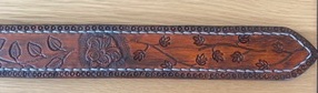 Eine Steigerung ist dann nur noch der punzierte Gürtel wie er hier als Gürtelspitze zu sehen ist. Dabei wird ein naturgegerbtes Rindleder verarbeitet. Zuerst werden die Motive eingeschlagen und die 3D Punzierung vorgenommen, dann wird die Lochung für die Naht gemacht, danach wird eingefärbt und veredelt, die Löcher werden geschlagen und die Druckknöpfe eingearbeitet. Zum Schluss kommt die Handnaht. Das Resultat ist ein aussergewöhlicher Gürtel.