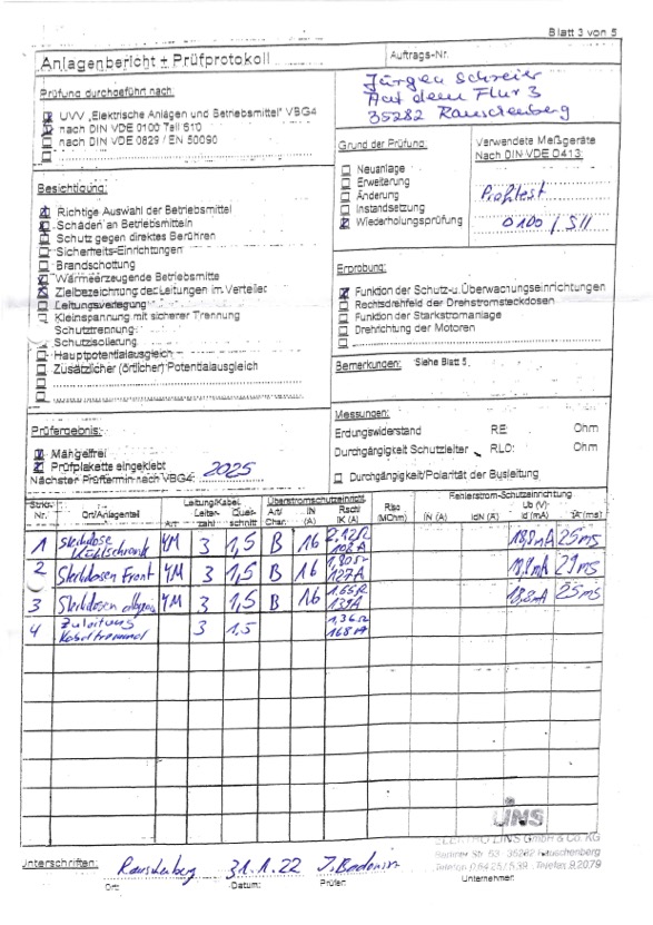 Prüfprotokoll für FI und die korrekte Verkabelung unserer Lederhütte